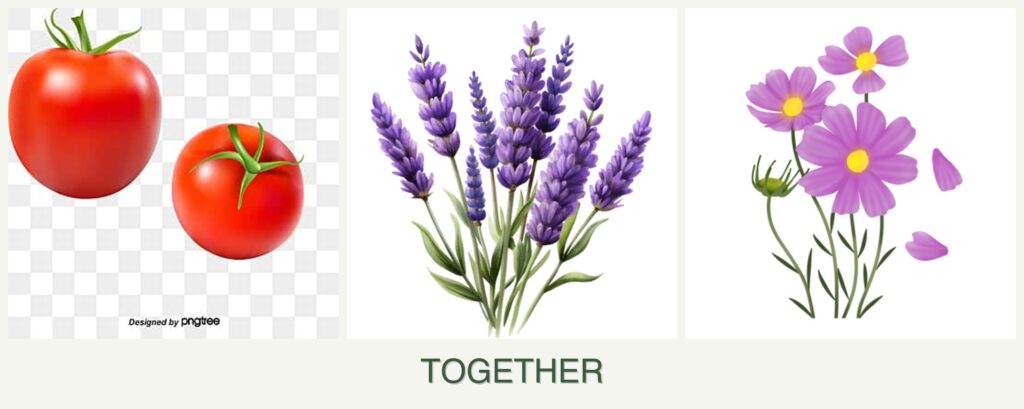 - Nutrient Needs: While tomatoes are heavy feeders, lavender and cosmos have moderate nutrient needs, reducing competition.