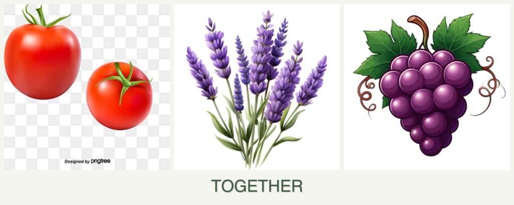 - Resource Competition: Tomatoes and grapes may compete for nutrients, overshadowing lavender.