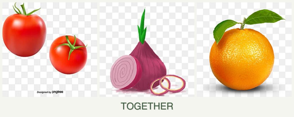 Growth Requirements: Tomatoes and onions have similar needs, such as full sun and well-draining soil. Oranges, however, are fruit trees that require more space and have different watering and nutrient needs.