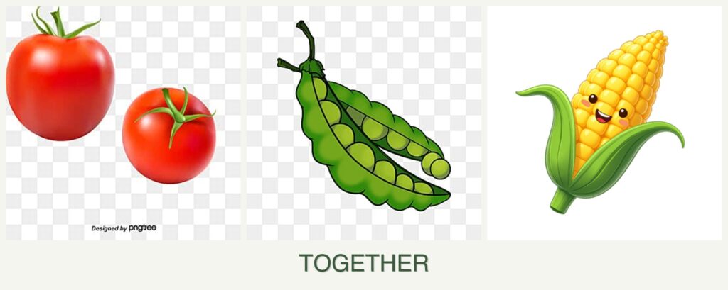 Growth Requirements: Tomatoes and corn both need full sun, while peas can tolerate partial shade. Corn grows tall and can provide support for peas, which are natural climbers. However, tomatoes should be placed where they won’t be overshadowed by corn.