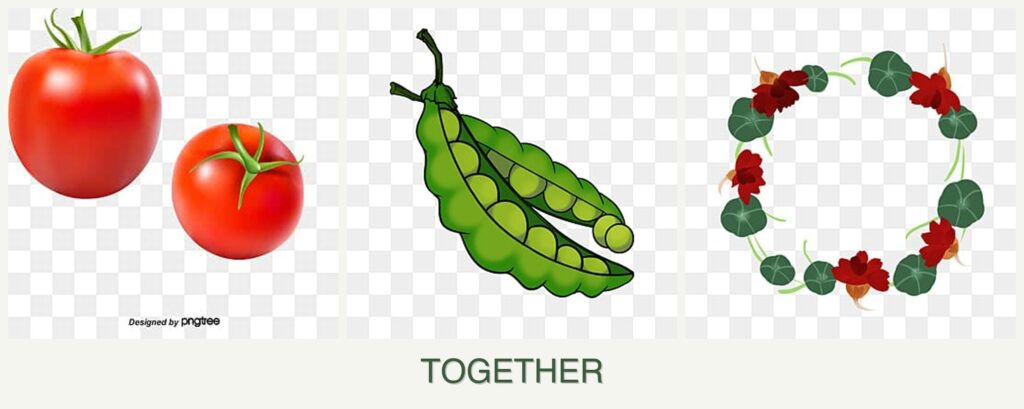 Space Efficiency: Their differing growth habits allow for efficient use of garden space, with peas climbing up trellises, tomatoes growing upright, and nasturtiums spreading out.