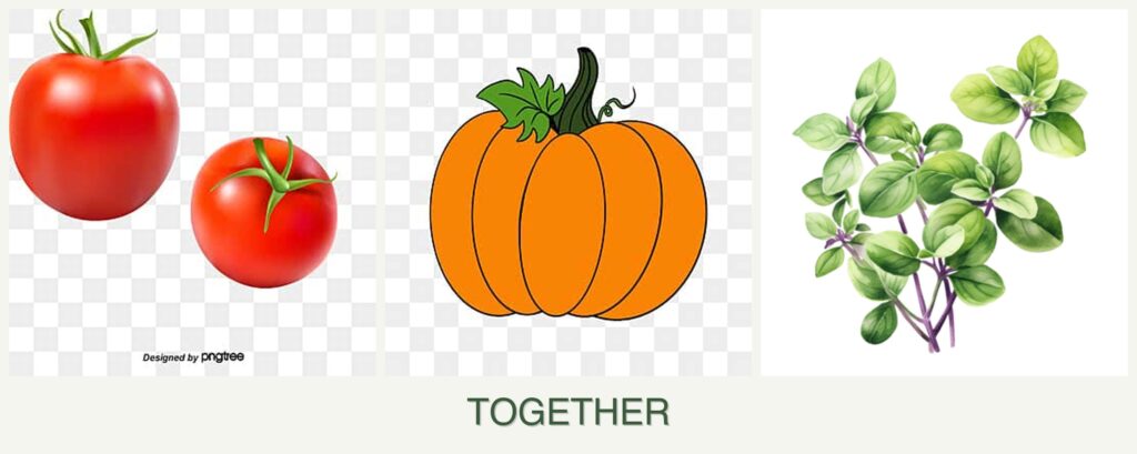 - Growth Requirements: Tomatoes and oregano thrive in similar conditions, while pumpkins need more space.