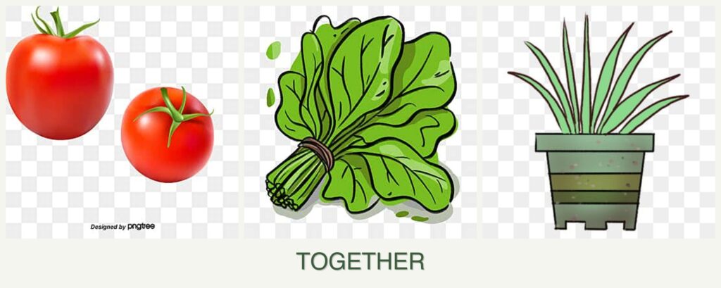 - Spinach grows well in cooler weather and can be planted in the shade of taller plants, making it a good companion for tomatoes.