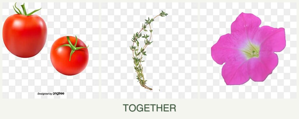Planting tomatoes, thyme, and petunias together offers several advantages: