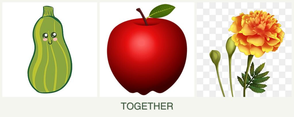 - Nutrient Needs: Zucchini and marigolds have similar soil nutrient requirements, whereas apples may need additional fertilization.