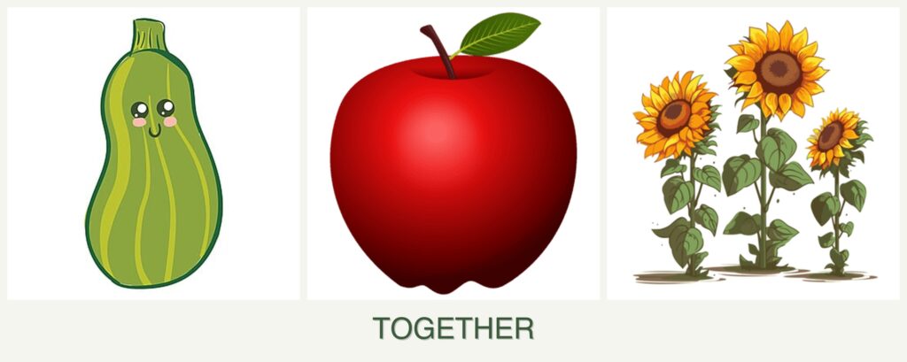 - Space Efficiency: Vertical growth of sunflowers and apples allows ground space for zucchini.