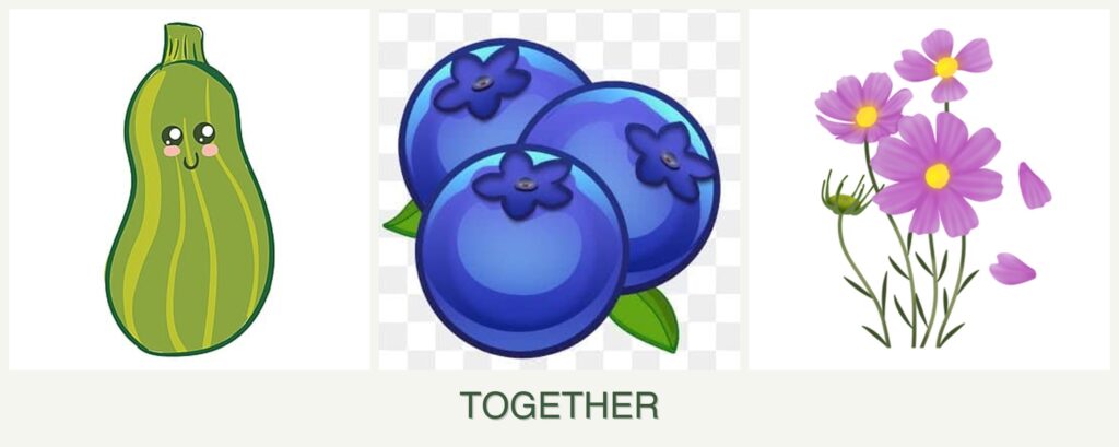 - Timing: Plant cosmos after the last frost, zucchini during warm weather, and blueberries in early spring or fall.