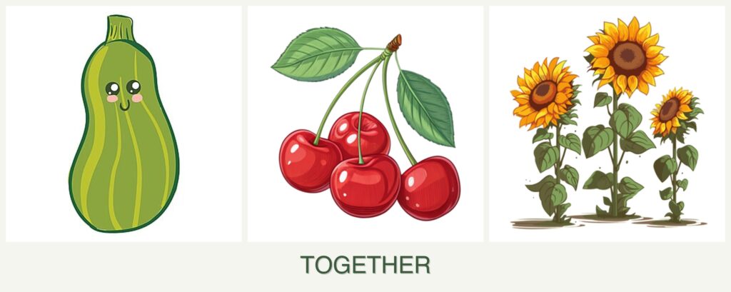Nutrient Needs and Spacing: All three plants have different nutrient requirements and spacing needs. Zucchini and sunflowers can compete for nutrients if planted too closely, while cherries, being trees, have deeper roots that can avoid direct competition.