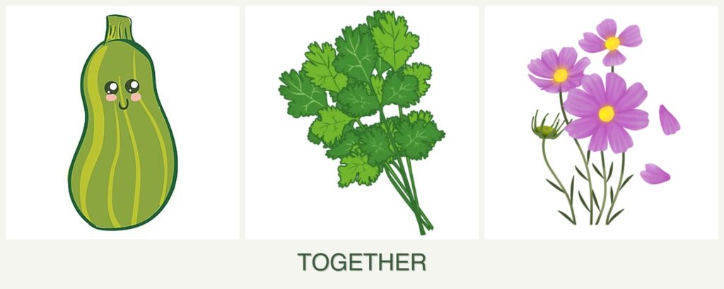 Planting zucchini, cilantro, and cosmos together offers several advantages: