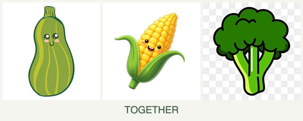 Nutrient Needs: Zucchini and corn are heavy feeders, requiring rich soil, whereas broccoli needs a slightly cooler environment and can help suppress weeds.