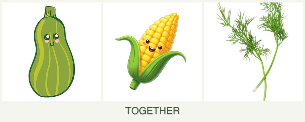 - Growth Requirements: Zucchini and corn both enjoy full sun and well-drained soil. Dill, while also sun-loving, can tolerate partial shade.