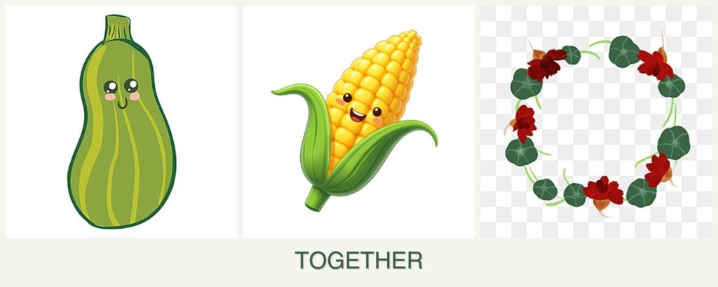 - Timing: Plant corn first, followed by zucchini and nasturtiums once the soil warms.