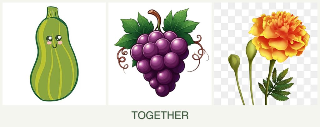 - Space Efficiency: Grapes grow vertically, allowing zucchini to spread on the ground, with marigolds filling gaps.