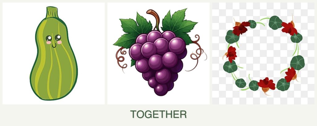- Growth Requirements: Zucchini and nasturtiums both prefer full sun and well-drained soil, while grapes need a sunny spot with good air circulation.