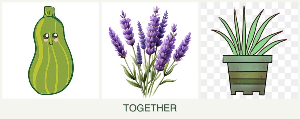 - Resource Competition: Zucchini’s high nutrient and water needs can compete with lavender and lemongrass.