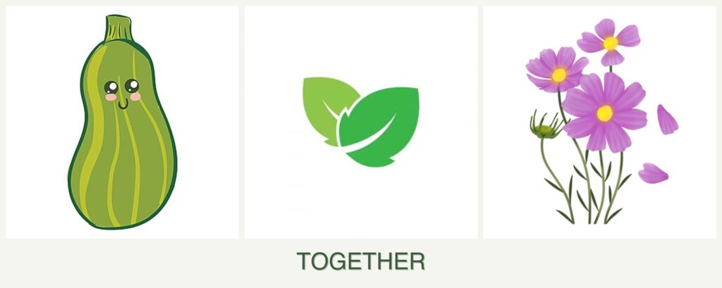 Pest Control: Mint is known for its pest-repelling properties, which can benefit zucchini by deterring squash bugs and aphids. Cosmos attracts beneficial insects like bees and butterflies, promoting pollination and ecosystem health.