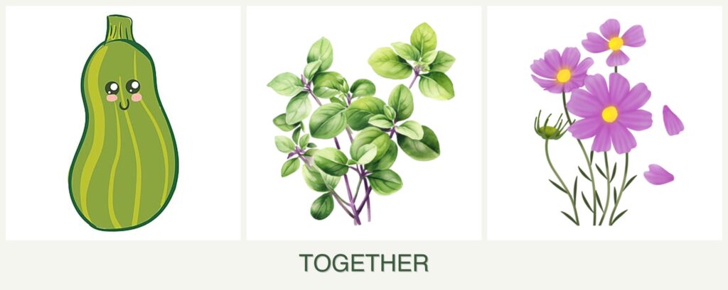 Planting zucchini, oregano, and cosmos together offers several benefits: