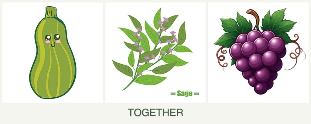 - Pest Control: Sage can deter some pests, but zucchini and grapes have distinct pest issues.