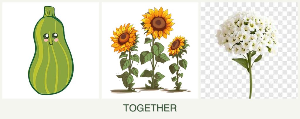 - Nutrient Needs: While zucchini is a heavy feeder, sunflowers and alyssum have moderate nutrient requirements, reducing competition.