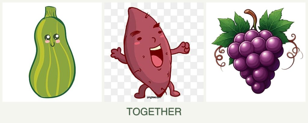 - Nutrient Needs: Zucchini and sweet potatoes are heavy feeders, needing rich, organic soil, while grapes require well-balanced nutrients, which might lead to competition if grown together.